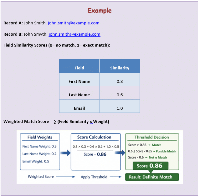 Together, weighting and match threshold tuning control whether records are merged automatically, flagged for review, or kept separate.