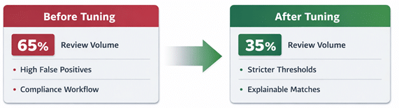 At the highest level of maturity, tuning is continuous and evidence-based. Human review decisions are systematically captured and fed back into the matching system.