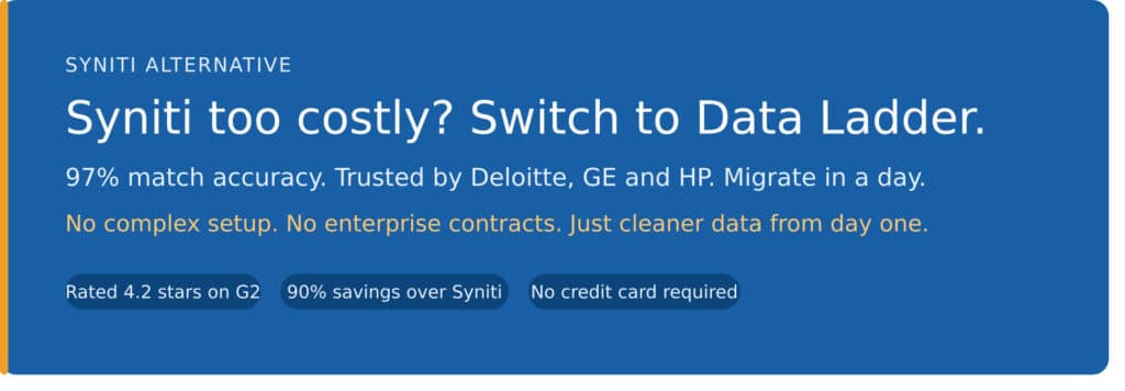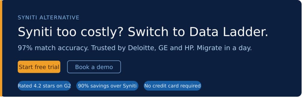 Syniti may be a strong choice when you’re launching a multi-year data governance program. Data Ladder is ideal when you need answers this quarter or this week. If you’re looking for a faster Syniti alternative for data matching and cleansing, Data Ladder is your best bet.